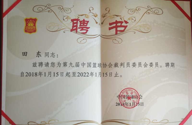 中国篮球协会裁判员委员聘书