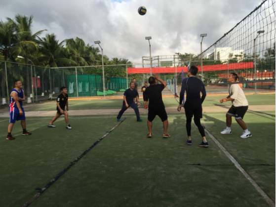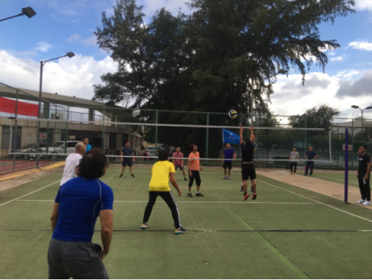 尽管蒙蒙秋雨延迟了开赛时间,却没影响广大教职员工参与比赛的积极性。等待过程中现场气氛已相当激烈,运动健儿们翘首以待。雨过天晴,随着裁判的一声哨响,比赛正式拉开序幕,“战势“一触即发,双方势均力敌,难分上下。队员们各施绝技,相互鼓励,依靠丰富的经验,精湛的技术以及默契的配合频频得分,场上一个个精彩的发球、精准的二传、大力的扣杀、智慧的吊球等精彩的球技赢得了场边观众的阵阵喝彩。