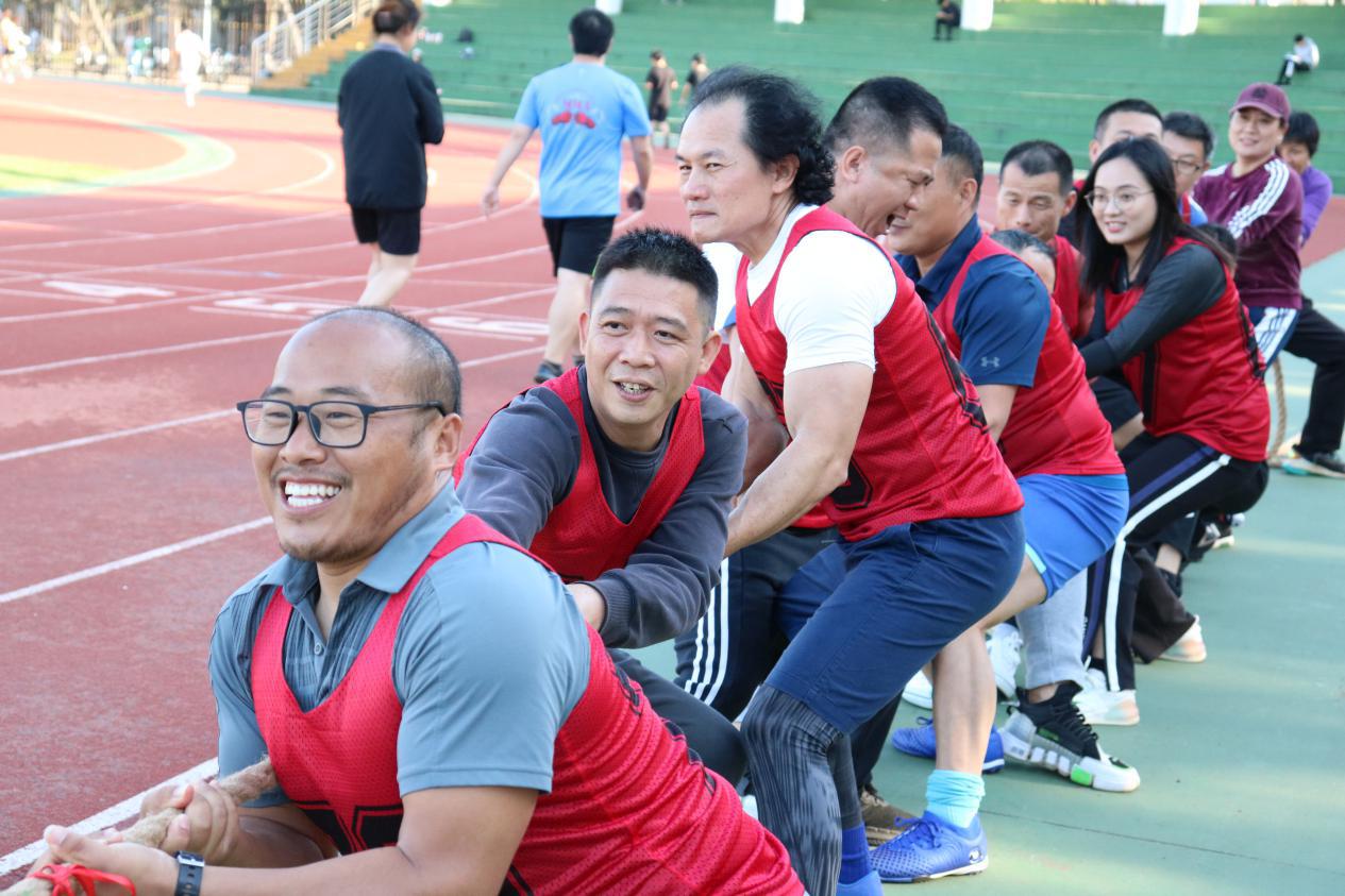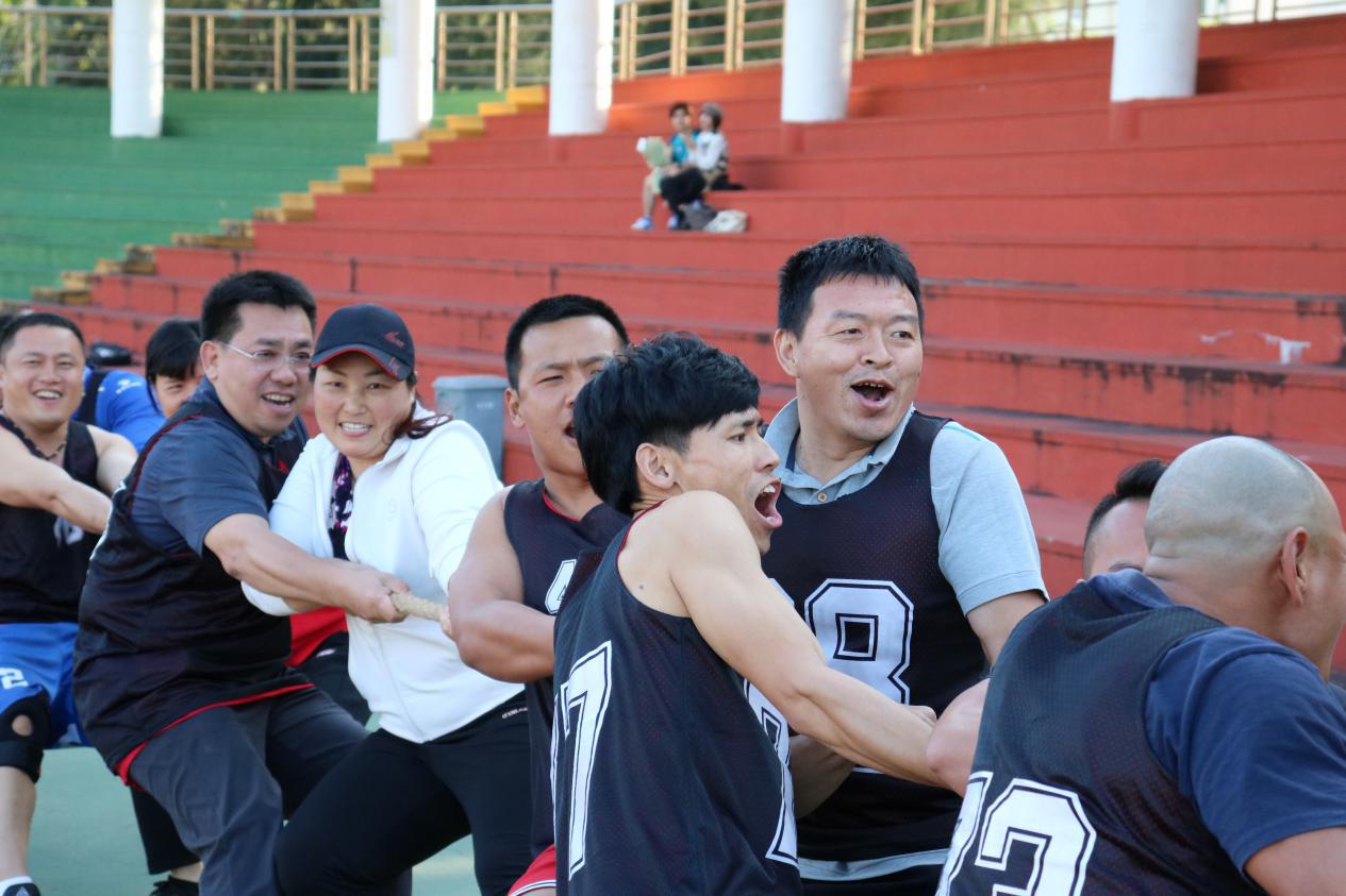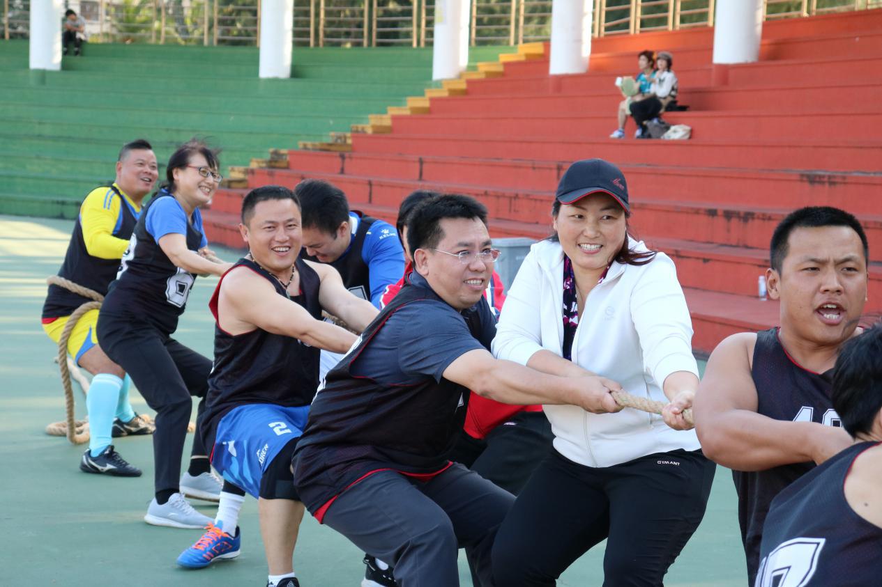 活动第一项,进行男女混拔河比赛。哨声响起,红黑两队握紧长绳,卯足了劲儿拼命往后拉,未参赛队员也在一旁齐声欢呼,为队员们加油。一时间,哨子声、呐喊声此起彼伏,双方不相上下的气势一度将比赛推至高潮,黑队拔得头筹,乘胜追击,最终拿下比赛。