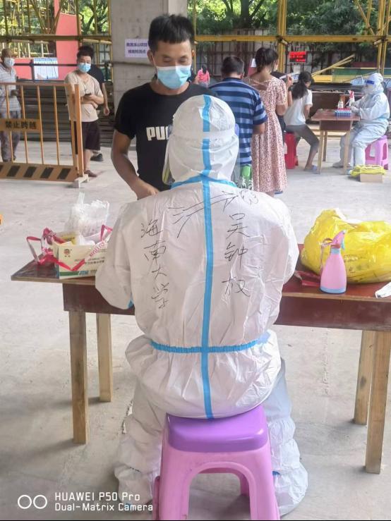 从海口市到三亚市,从三亚市到下沉到吉阳区下洋田社区居委会;从8月8日吴忠权老师签下支援三亚抗疫志愿者同意书到宣告完成抗疫任务;从第一次穿隔离服、防护服到脱下白衣穿回自己衣服;从第一次扫码、第一次采集核酸、第一次上门,无数个第一次,共采集5678人次,最多的一天采集超过350人。吴忠权老师为自己的付出感到骄傲;从刚开始和居民的沟通障碍,到离开时的依依不舍,细细回味让他觉得生命的价值在那一刻陡然升值。